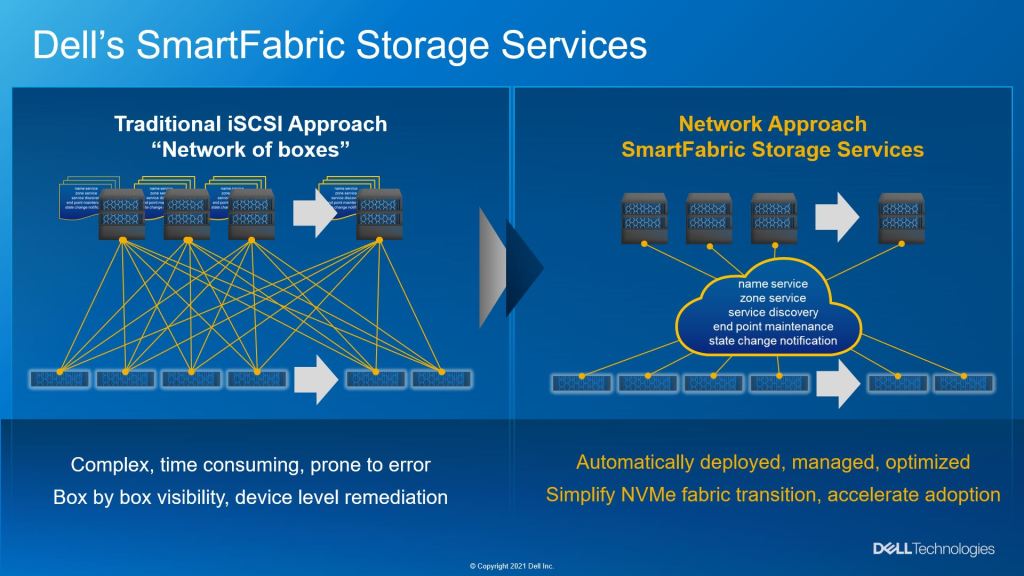 Storage based IP networks leveraging the NVMe protocol can provide a cost effective, high performance connectivity alternative to traditional Fibre Channel SANs. While ecosystem support, such as VMware, is maturing, the tools required to set up and manage NVMe based networks lack the automation and integration compared to Fibre Channel. Providing admins with similar IP based automation tools is a key requirement to drive adoption and simplify management at scale. The introduction of Dell’s Smart Fabric Storage Services (SFSS) addresses these challenges. Deploying storage with NVMe over IP using SFSS provides the necessary automation to significantly simplify and standardize the management these deployments. Leveraging SFSS will help accelerate adoption of this new technology and maximize IT’s ability to leverage the cost and performance benefits of NMVe over IP.