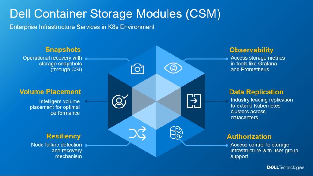 Dell’s Container Storage Modules (CSM) brings powerful enterprise storage features and functionality to containers for easier adoption of cloud native workloads, improved productivity, and scalable operations. This release delivers software modules for storage management that provide developers with access to build automation for enhanced IT needs and other critical enterprise storage features like data replication across data centers, role-based access control authorization, observability and resiliency for disaster recovery and avoidance. CSM will offer full availability for all major storage products in the future. New releases will be coming on a quarterly basis.
