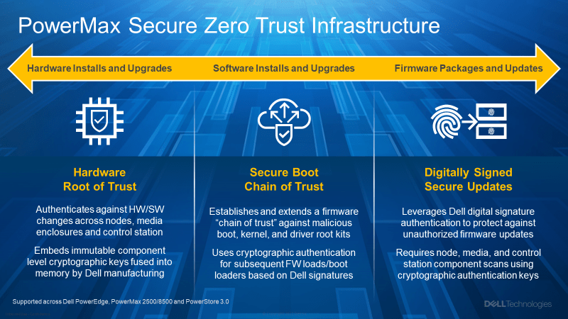 With Zero Trust, technology components will consistently behave in expected ways. Those behaviors will be enforced by an securely coupled computer hardware and software stack. Enforcing this behavior is achieved by using the hardware with a unique encryption key that is inaccessible to the rest of the system and requires software loads and changes to authenticate at each step in a particular process. The technology based on a “Hardware Root of Trust”” and has existed in the server space for several years. Dell PowerEdge introduced this in 2017 with 14G and is now being introduced to the storage array layer for the first time.